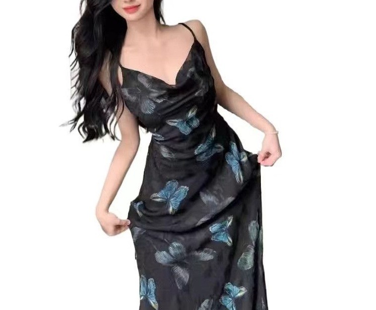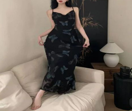 Womens Retro Butterfly French-Style Slim-fit Slip Dress